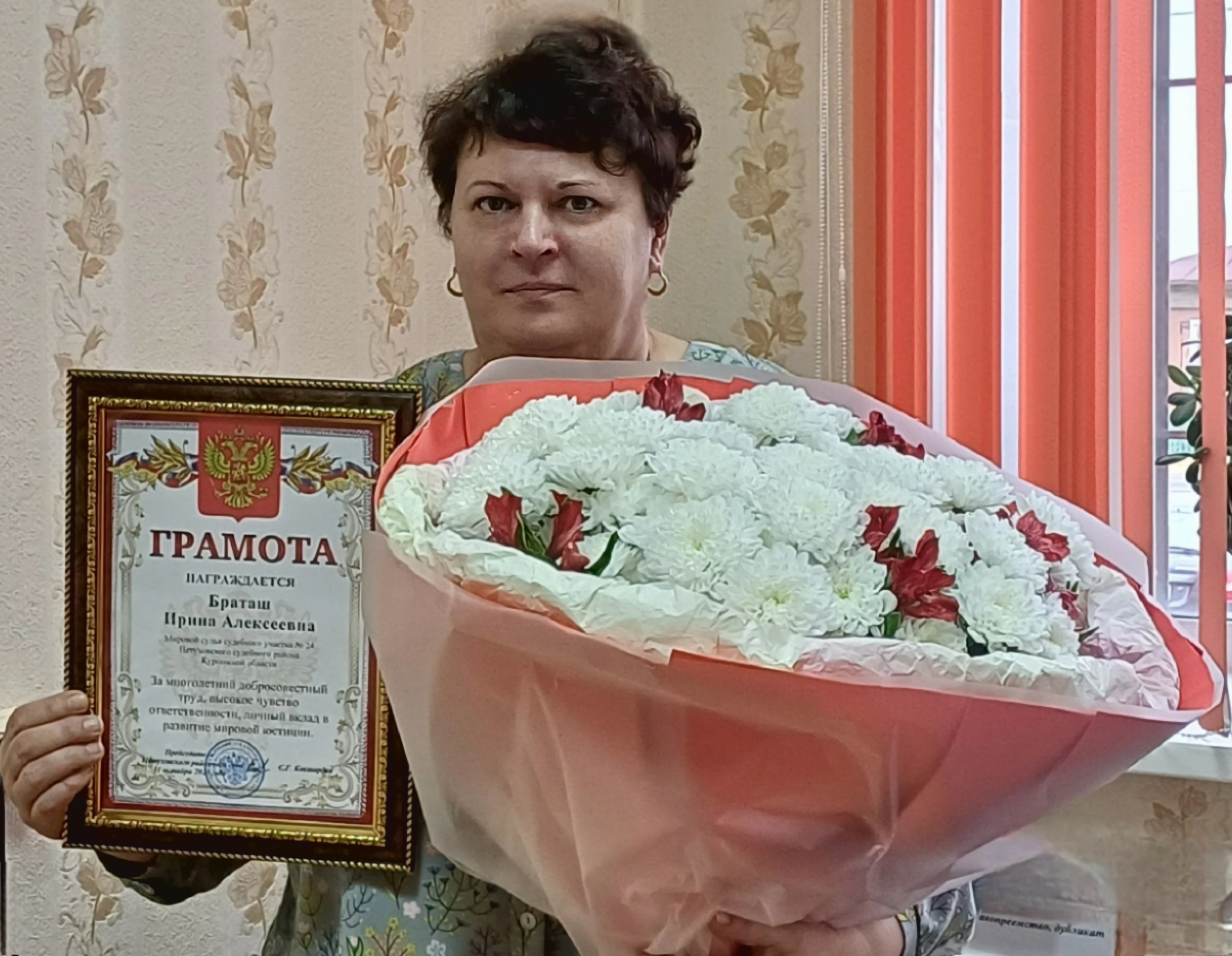 Коллектив Петуховского районного суда Курганской области торжественно проводил в почетную отставку мирового судью судебного участка № 24 Петуховского судебного района Браташ Ирину Алексеевну. В июле 2011 г. Ирина Алексеевна начала свою трудовую деятельность в судебной системе в должности помощника судьи Петуховского районного суда. Постановлением Курганской областной Думы № 287 от 25 сентября 2012 г. назначена на должность мирового судьи судебного участка № 24. Браташ И.А. специализировалась на рассмотрении уголовных, гражданских и административных дел, а также дел об административных правонарушениях, подсудных мировому судье. За годы работы она зарекомендовала себя ответственным и грамотным специалистом. Приказом Судебного департамента в Курганской области от 28 октября 2025 г. Браташ И.А. исключена из штата мировых судей Курганской области 31 октября 2025 г. в связи с истечением срока полномочий. Председатель суда Ковшарова С.Г. поздравила Браташ И.А., поблагодарила ее за совместную работу, добросовестное служение правосудию, самоотдачу и преданность делу, пожелала здоровья и благополучия, а также не терять связь с коллективом суда. Работники суда, представители Администрации Частоозерского муниципального округа, Прокуратуры Частоозерского района, Частоозерского РО СП УФССП России по Курганской области тепло попрощались с Ириной Алексеевной, в ее адрес прозвучали поздравления, слова признательности, пожелания. В свою очередь Ирина Алексеевна поблагодарила всех за поддержку, взаимопомощь и пожелала всем успехов.